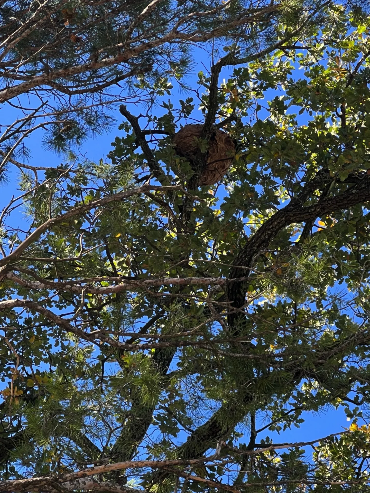 Nous avons été sollicités par un client particulier qui a découvert un nid de frelons asiatique, niché en haut d’un arbre, à environ 20 m de hauteut sur son terrain à Martigues 13700 dans les Bouches-du-Rhône.