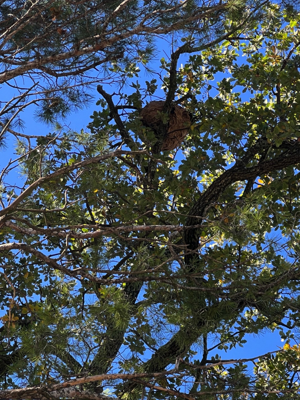Effectivement, à l’automne lors de la chute des feuilles, les nids de frelons asiatiques, perché en haut des arbres sont de plus en plus visibles.