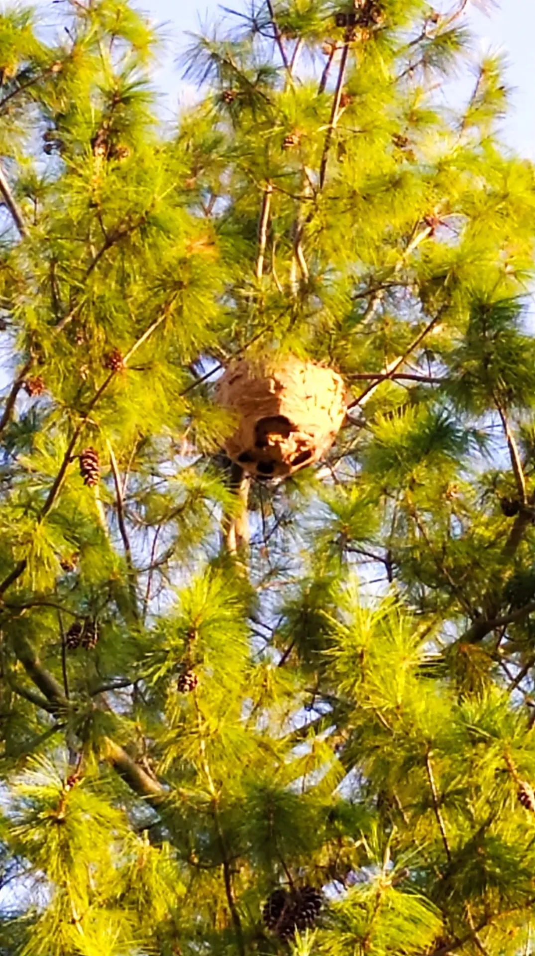 Une école maternelle a fait appel à la société Fbc nuisibles suite à la découverte d’un gros nid de frelons asiatiques tout enhaut d’un arbre de la cour de récréation.